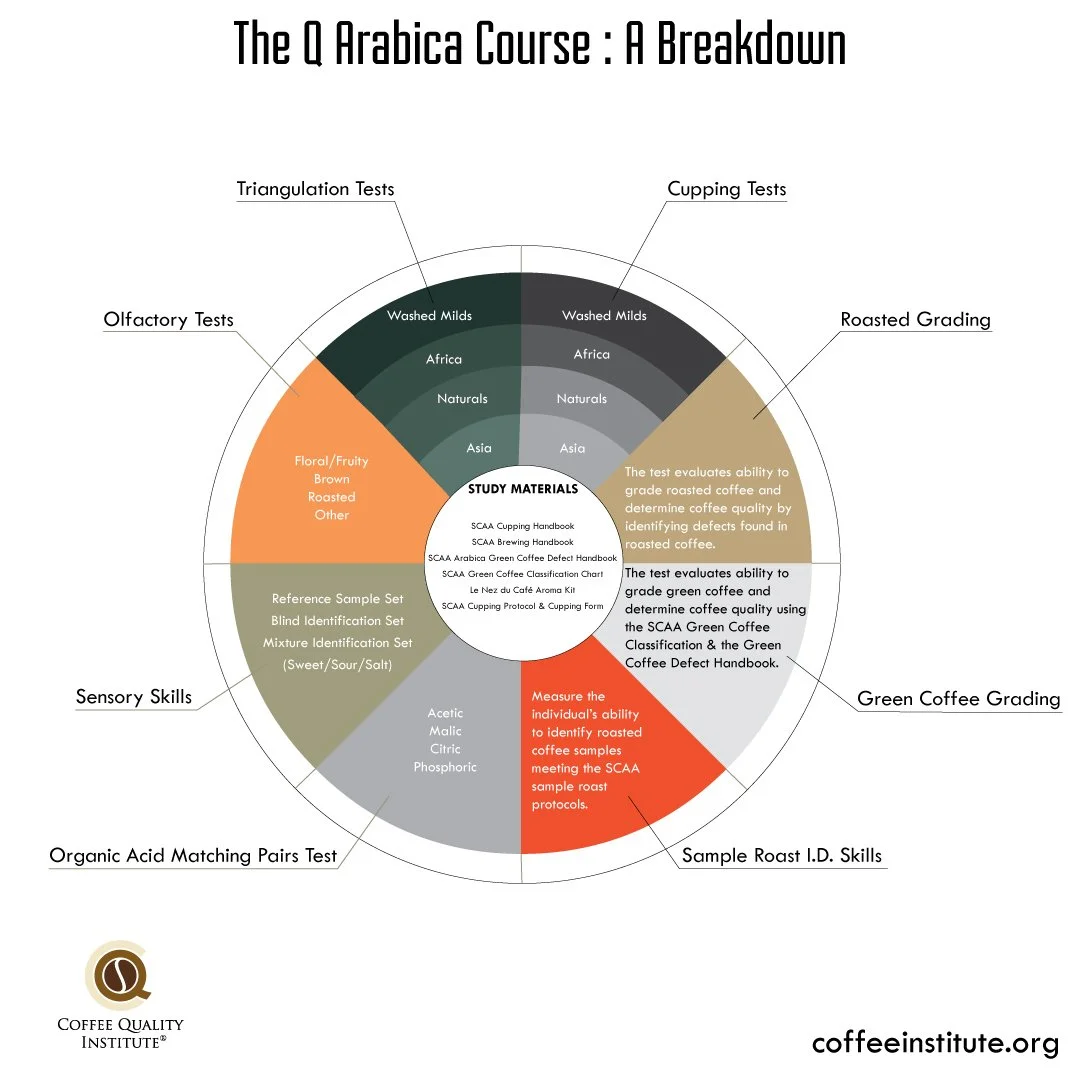 Q represents quality. In order to become Q certified for Arabica coffee, one must take a 6-day training and exam course. The course is very difficult and some students find it difficult to pass all 19 exams the first time. However, students have the ability to retake exams, and certified Q Graders must calibrate every three years to validate their certification.
